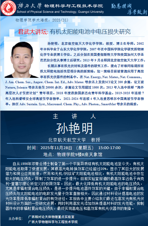 2025年学术报告系列之31:君武大讲坛:有机太阳能电池中电压损失研究