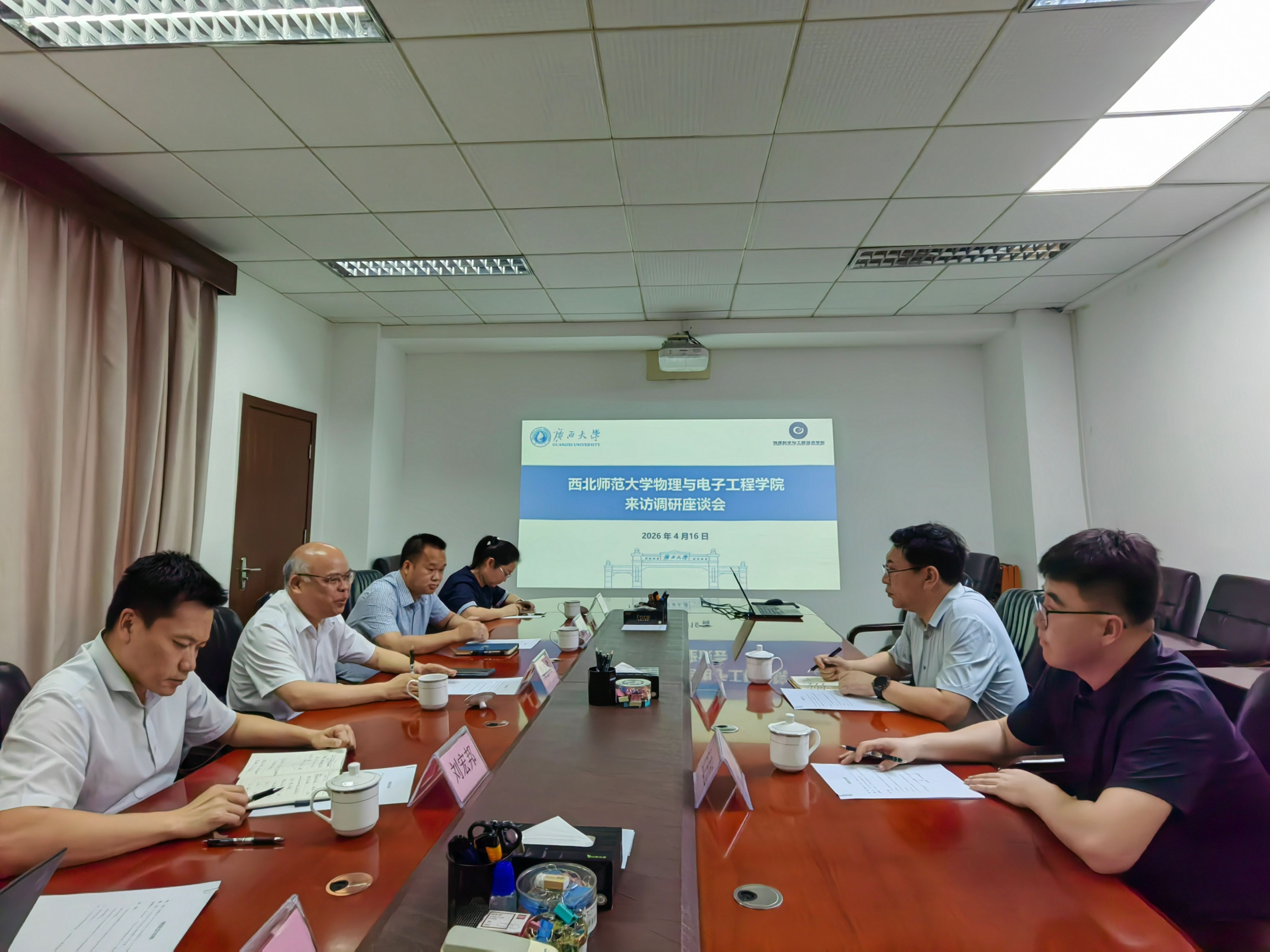 4月16日,西北师范大学物理与电子工程学院院长丁晓彬一行到院调研交流。校党委常委、副校长梁恩维,院党委书记蒋津辉,院长刘宏邦出席座谈会。