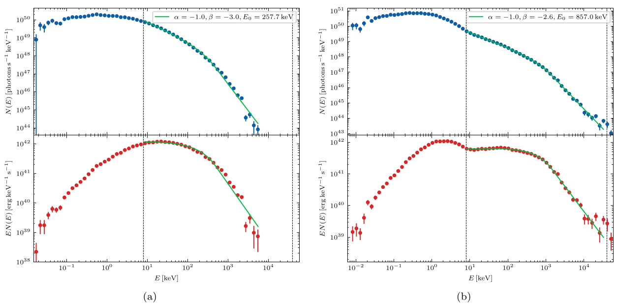 图2进一步展示了湍流模型重现典型GRB能谱特征:通过调节湍流的参数,能够在Fermi卫星能段(8keV—40MeV)内产生与多数观测数据一致的低能谱指数α∼-0.8、高能谱指数β∼-2.3的Band-like谱。