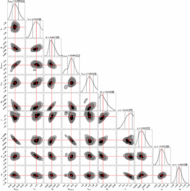图3. 双成分喷流模型的MCMC拟合结果的参数后验分布角图。